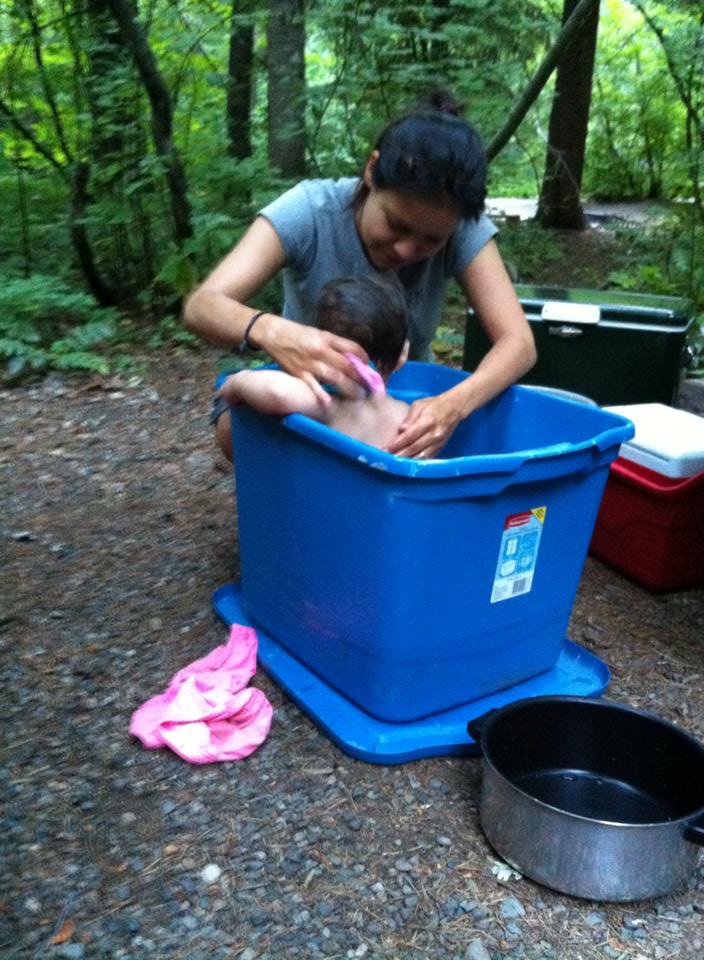 If you have a baby that crawls or toddler that walks they’re going to get dirty. There’s nothing you can do about it. Don’t freak out, just embrace it. We had plenty of baby wipes on hand to give her a quick clean when needed, but for the most part Cat was covered in dirt. Every night we heated up some water and bathed her in a plastic bin so she went into our tent squeaky clean. If there are showers at your campsite and your baby/toddler doesn’t mind bathing that way then go for it. When we took Cat camping the first time she could barely stand on her own without holding something and hated having water poured over her head. Taking her to the showers with me would have been stressful! So remember what I said about stress? Stress is bad, get rid of it. Make things easier on both of you if you can. So I took the time to bathe my girl every night before bed. It also helps them sleep soundly through the night!