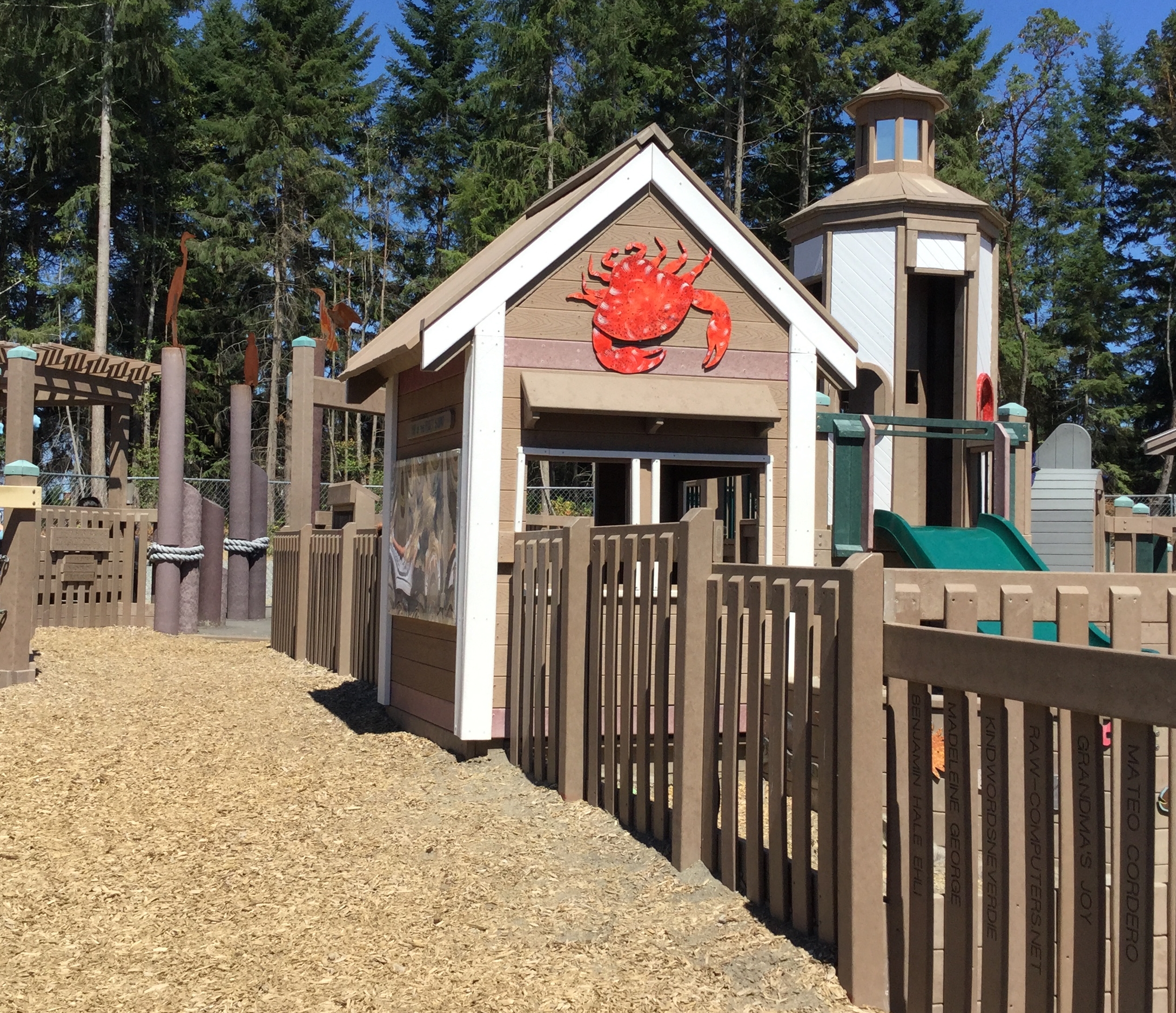 It has cool Northwest features like a lighthouse, orca whales, boats and more. It has every type of swing imaginable, even ones that allow the adult to sit in them and hold a child on their lap. It has all kinds of slides, a sandbox, and much more.