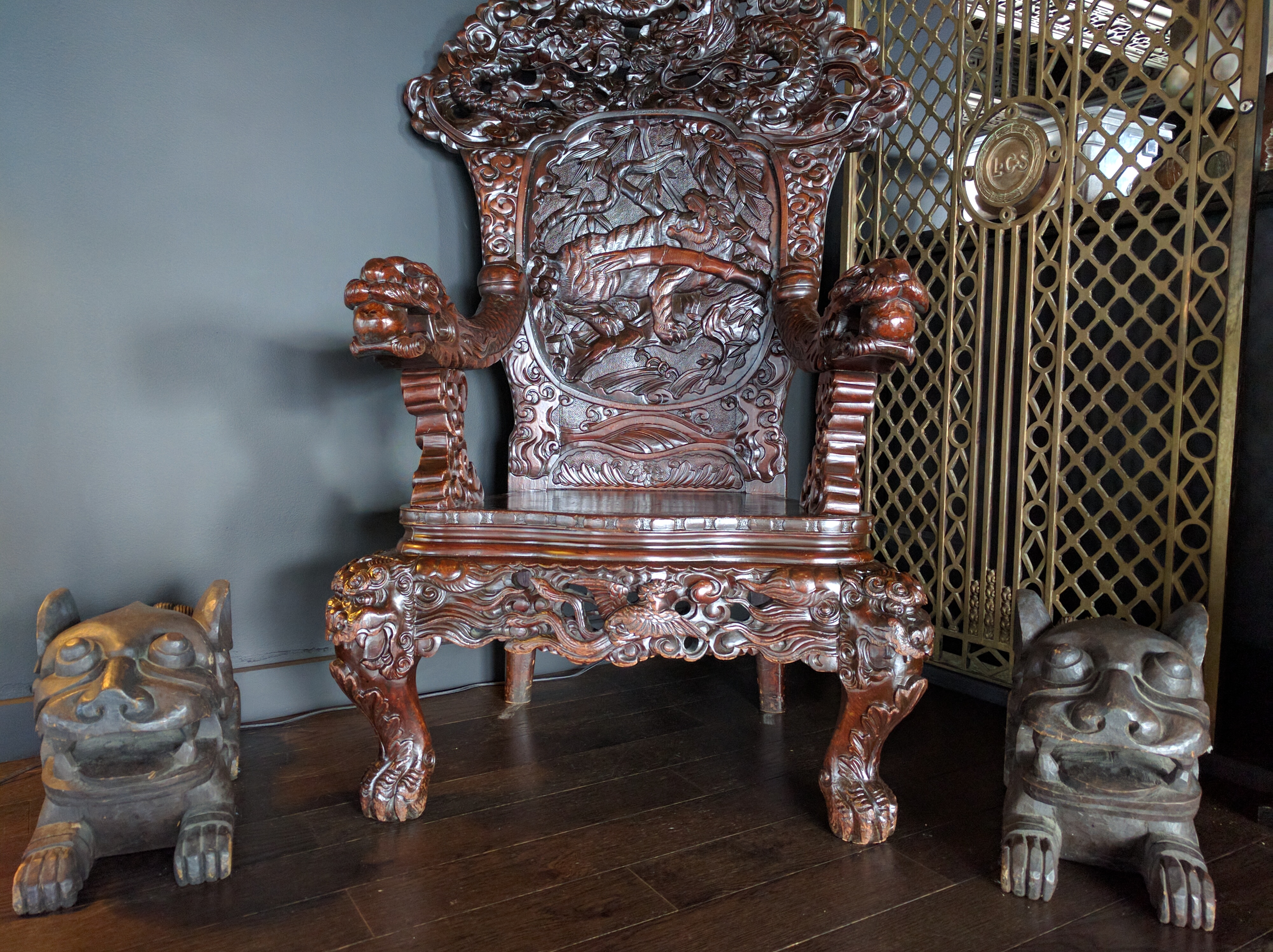 Everything about the room screams historic, including the furniture, the bar area – which also serves food – the painted ceiling and the famed Wishing Chair. The chair includes a carved dragon and a phoenix. Legend has it that a person wishing to get married sits in the chair and their wish will come true within a year.