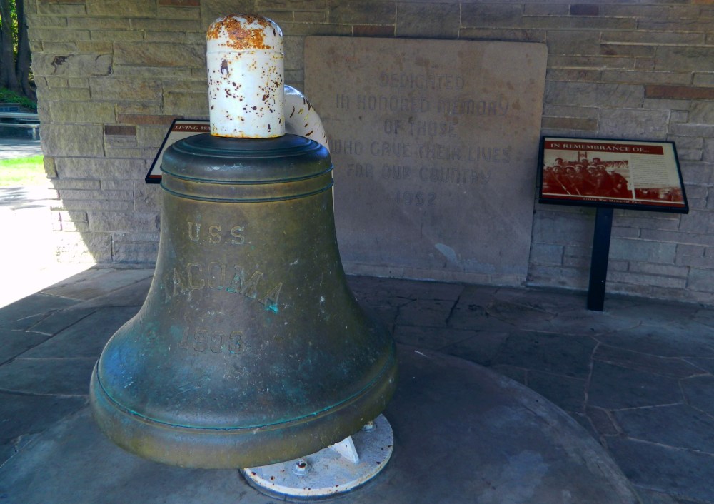 Upon parking, you come upon a structure featuring a large bell which comes from the USS Tacoma, which was commissioned in 1903 and later ran aground and broke up in high seas after serving in World War I. The bell was salvaged and shipped to Tacoma.