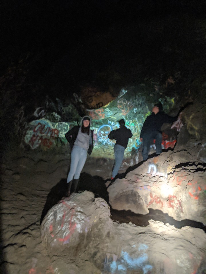 The cave runs a quarter mile under the ground and is about 50 feet deep. There is graffiti covering nearly every inch of the walls, plus a lot of garbage and remnants of fires. We saw a group of college-aged boys coming out and one was open carrying a handgun. So, either there is something in the cave to be afraid of or that guy has little man’s disease.